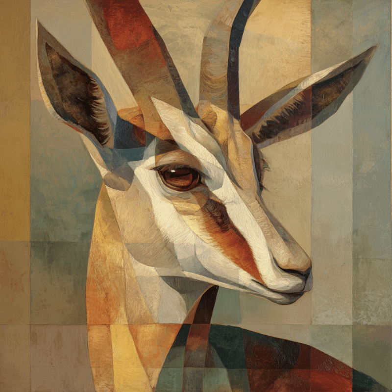 Experience the striking fusion of Minimalism and Expressionism in this muted-palette gazelle artwork, influenced by Franz Marc’s distinctive animal portrayal techniques. This bold Renaissance-inspired piece, created through AI-generation of classical glazing techniques, makes a statement addition to hallway décor while maintaining elegant simplicity.