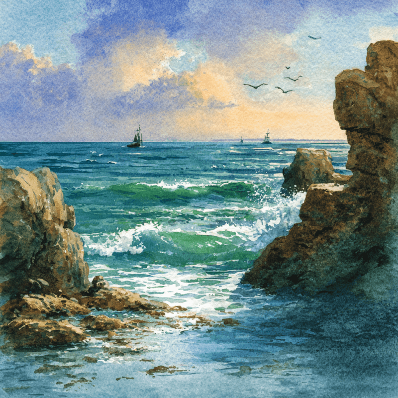 Contemplative Tides: Baroque-Inspired Watercolor Seascape