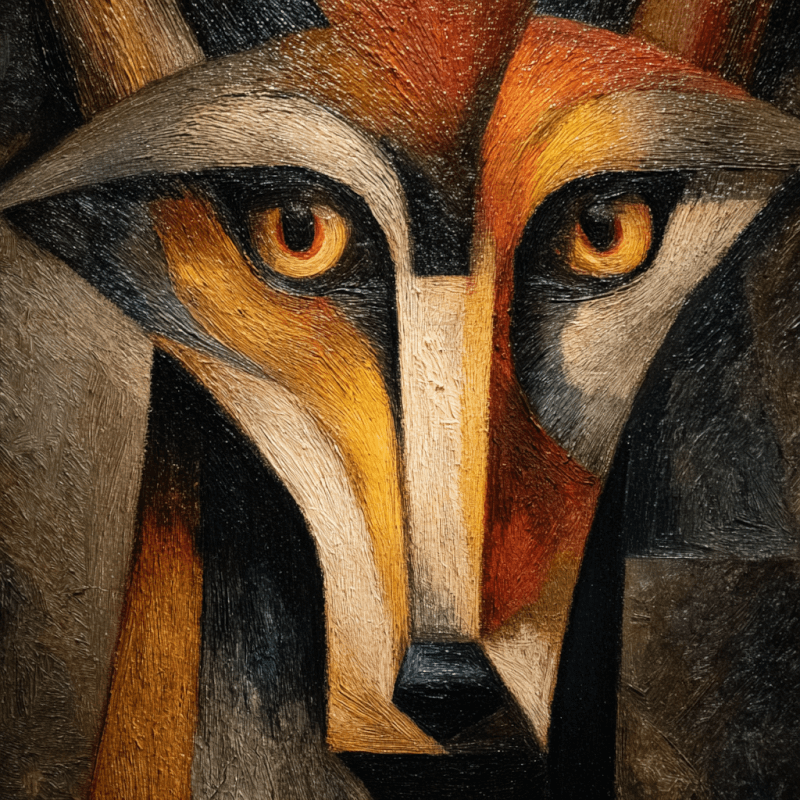 This captivating animal portrait masterfully blends traditional tenebrism with the geometric sensibilities of Lyubov Popova’s Constructivism. The subject emerges dramatically from darkness, its gaze mysterious and compelling, while bold angular elements frame the composition. Rich earth tones create depth and texture, with visible brushwork emphasizing the traditional craftsmanship behind this contemporary artwork.