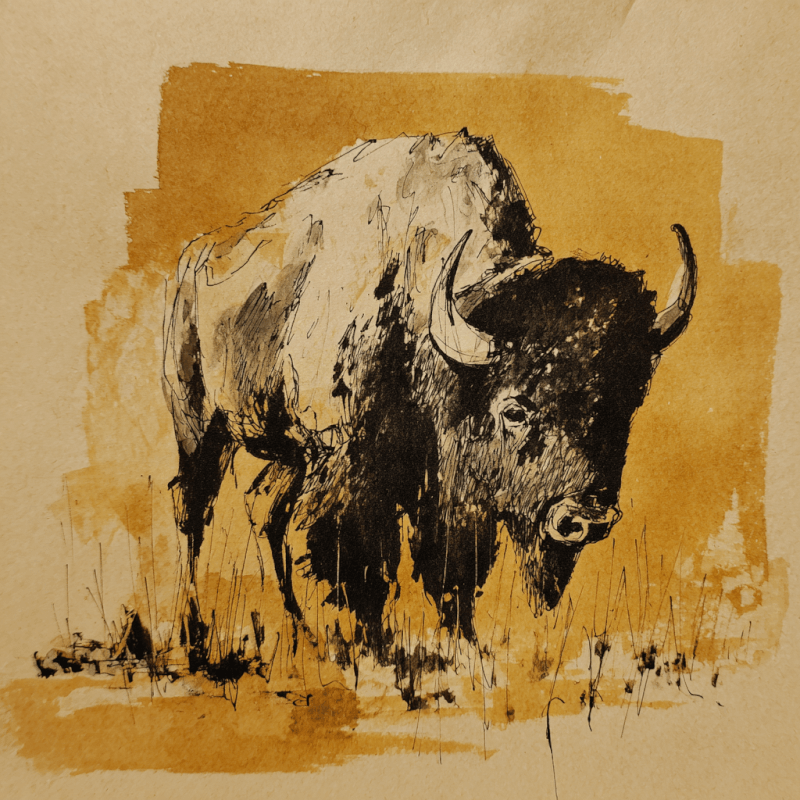 This striking ink drawing captures the majestic presence of the American bison through the distinctive lens of Abstract Expressionism. Bold, gestural strokes in rich earth tones create a powerful yet peaceful composition that honors both historical significance and artistic innovation. The piece draws direct inspiration from Robert Motherwell’s masterful use of negative space and organic forms, while incorporating Pop Art’s iconic approach to cultural symbolism.