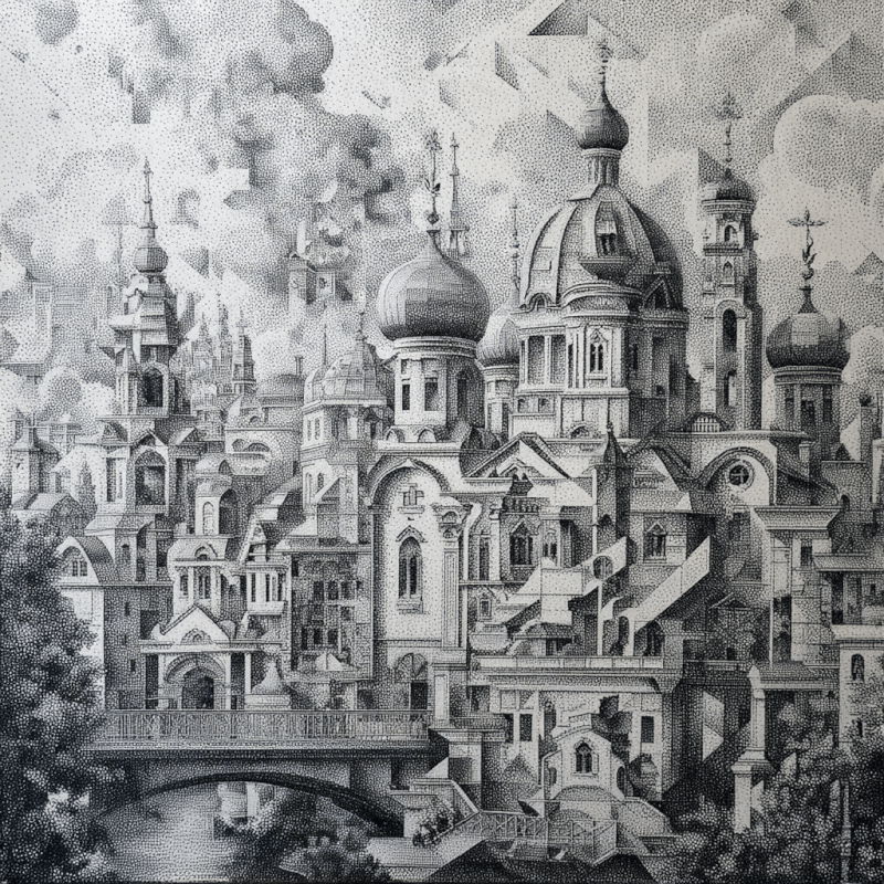 Step into a world where classical Rococo ornamentation meets the bold geometrical approach of Russian Constructivism. This captivating black and white cityscape employs meticulous pointillist technique to create a nostalgic urban vision that transcends time. Inspired by the revolutionary work of Kseniya Boguslavskaya, this piece reimagines baroque architectural grandeur through a modernist lens, creating a sophisticated statement piece for your bathroom or any contemplative space.