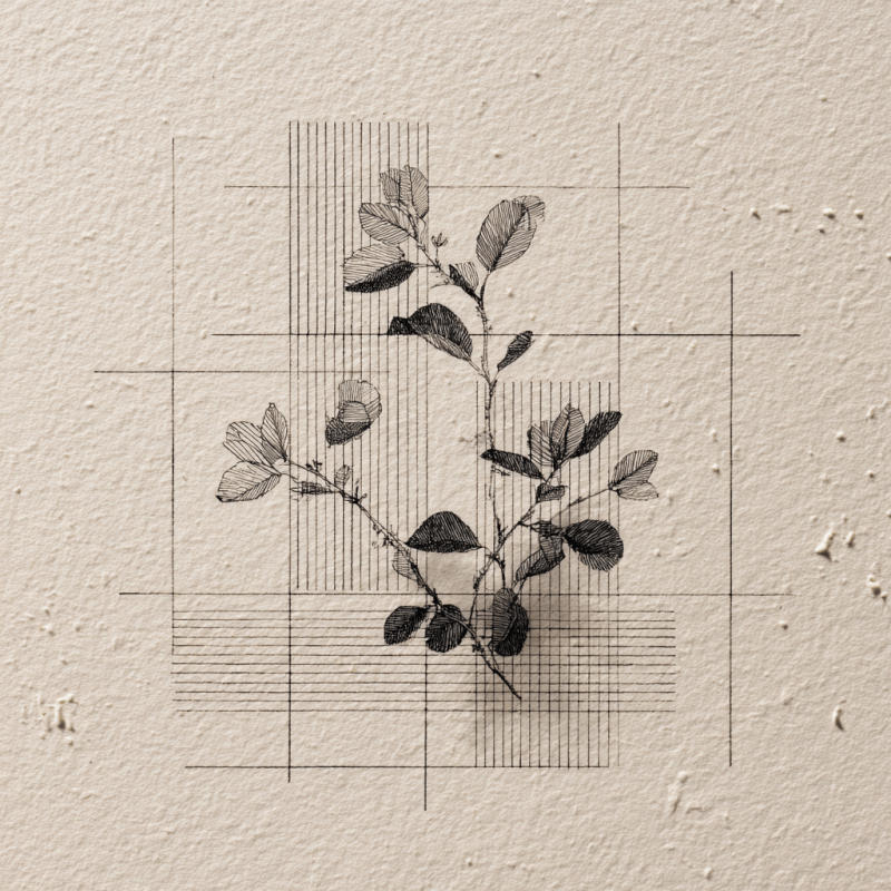 This striking ink drawing combines the geometric precision of Agnes Martin’s minimalism with surrealist botanical elements, creating a peaceful yet visually captivating piece for your kitchen space. Delicate plant forms emerge from a meticulously crafted grid structure, rendered in high-contrast ink that creates a stunning interplay between positive and negative space.