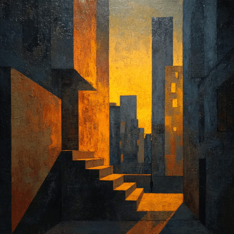 This captivating artwork marries the geometric precision of Jo Baer’s minimalism with the dramatic lighting of tenebrism technique. A contemporary cityscape emerges through carefully balanced positive and negative space, where warm amber light carves architectural forms from mysterious shadows.
